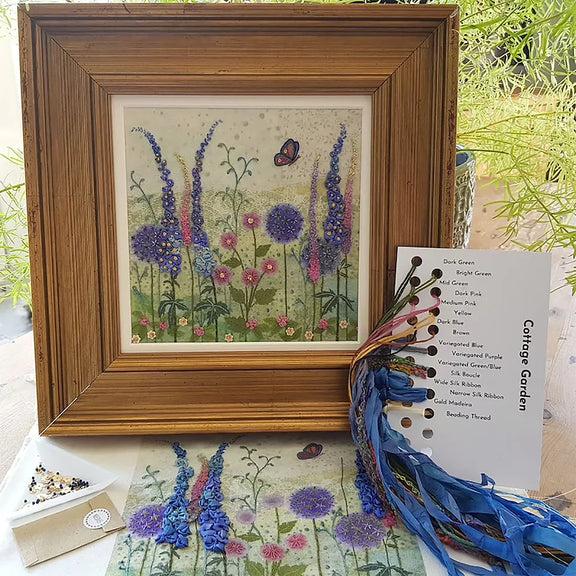 Stitch your own beautiful cottage garden with this relaxing hand embroidery kit. The design includes elegant delphiniums, colourful larkspurs and a pretty pink anemone against a fresh and summery pre-printed background.