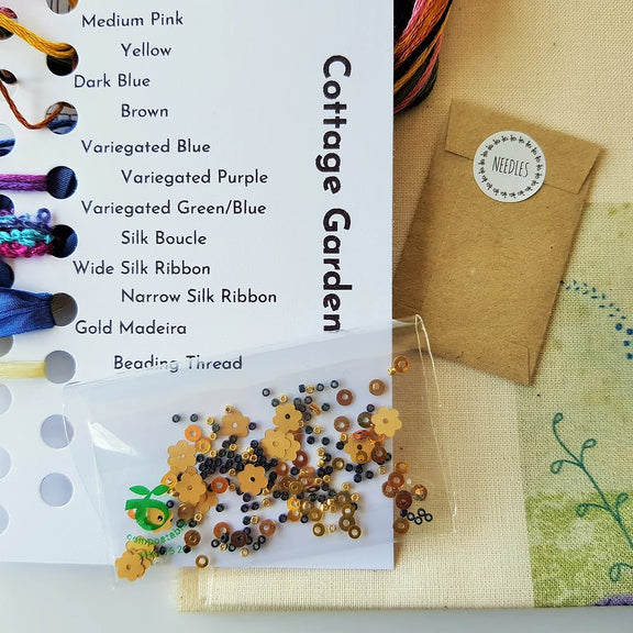 The kit gives you the chance to learn and practice an interesting variety of stitches including split stitch, chain stitch, back stitch and couching. You can also dip your toes into silk ribbon embroidery, learning how to create the delphiniums by using the silk ribbon to create loose French knots. You will also be guided through the process of adding a subtle sparkle to your work by using seed beads to anchor down delicate sequins and incorporating fine gold thread into your stitches.