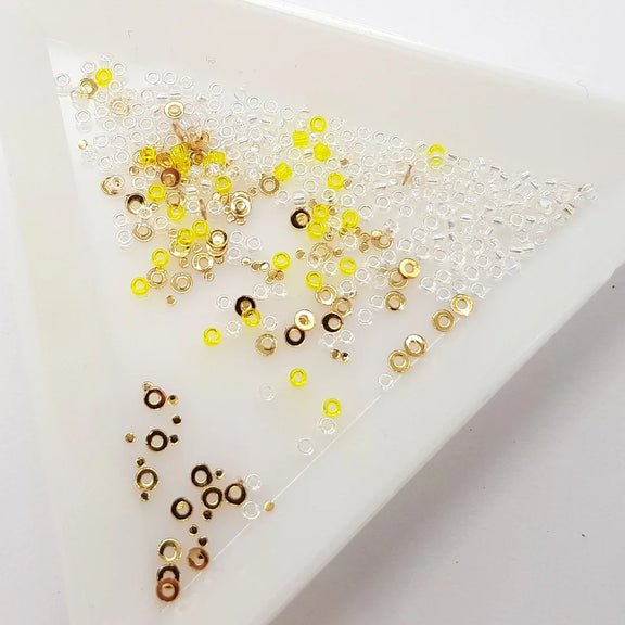 The kit gives you the chance to learn and practice an interesting variety of stitches including split stitch, buttonhole stitch, French knots and chain stitch. You will also be guided through the process of adding a subtle sparkle to your work by using seed beads to anchor down delicate sequins and incorporating fine gold thread into your stitches.