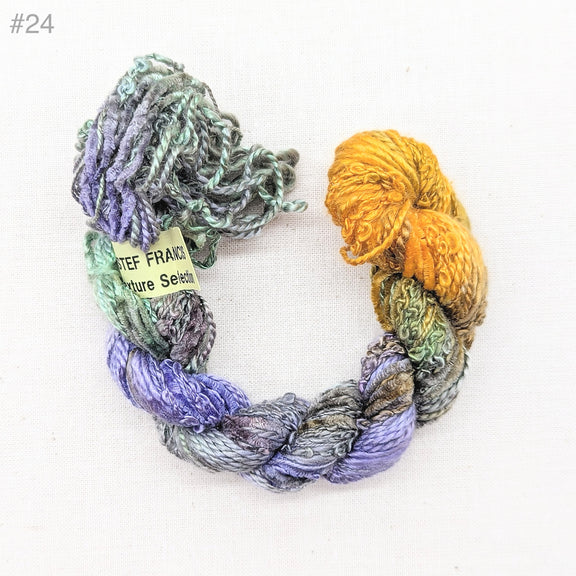 The Stef Francis Silk Texture Selection is a skein of 5 mixed silk yarns of different weights and textures, all hand-dyed together in the same variegated colourway.