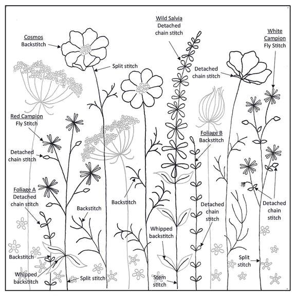 The embroidery gives you the chance to learn and practice an interesting variety of stitches including split stitch, detached chain stitch and back stitch, along with French knots and fly stitch. If you are new to stitching don’t worry as the illustrated Stitch Glossary is there to guide you through each stitch step by step, alongside full written directions and clear labelled diagrams showing where the different stitches are used.