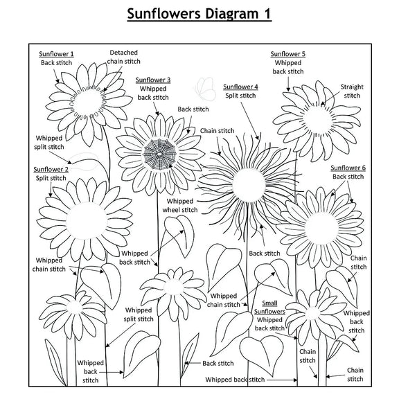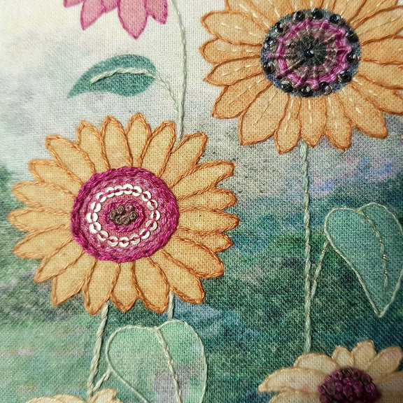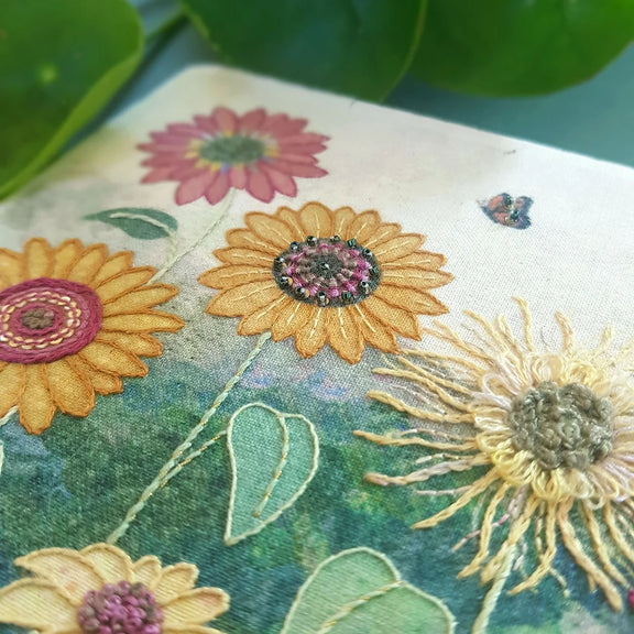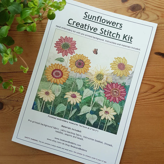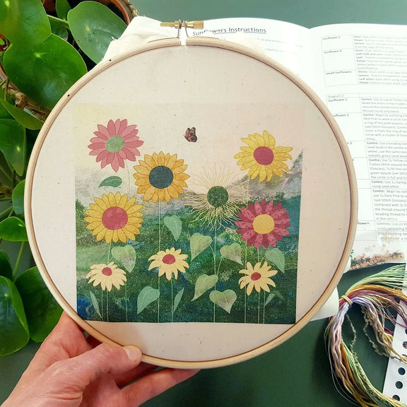 This embroidery kit includes a printed background with all the instructions you need to add the stitching and embellishments to bring it to life and create your own sunflower garden.